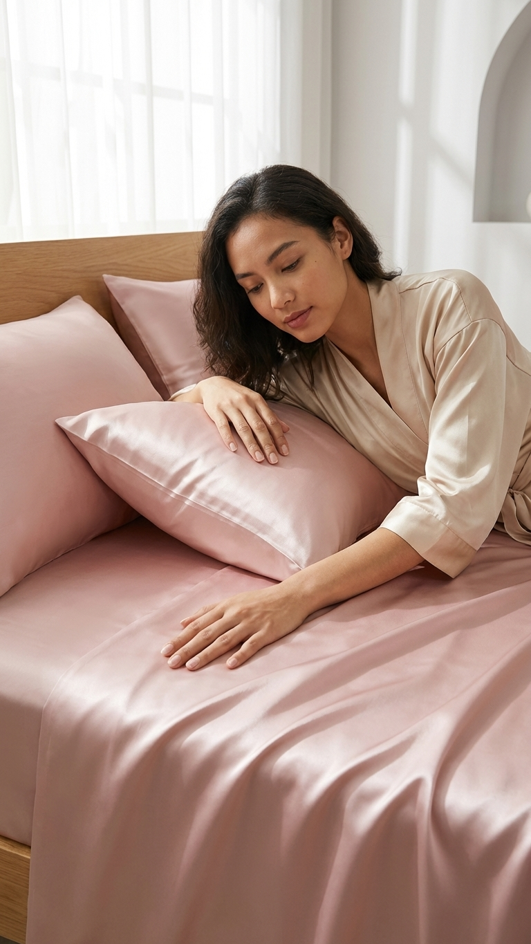 Slapen op 22 momme zijde betekent dat je je hele lichaam de voordelen geeft die je gezicht al krijgt met een zijden kussensloop. Hydratatie, thermoregulatie, hypoallergeen — versterkt over het hele lichaam.