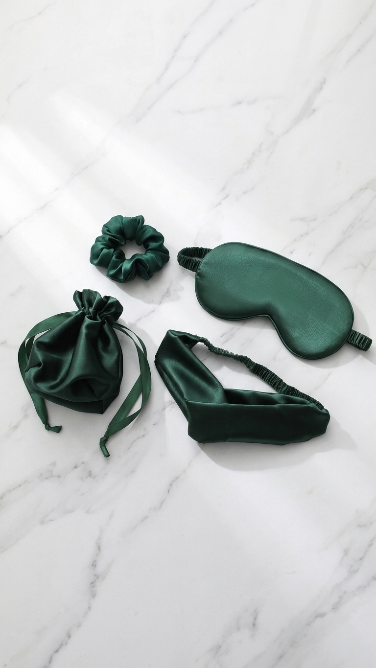 L'ensemble cadeau satin premium comprend une sélection de pièces en satin coordonnées, présentées dans un packaging cadeau élégant prêt à offrir.
